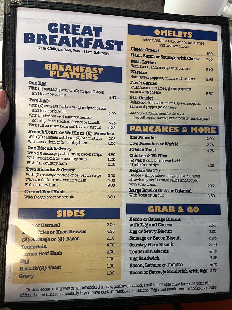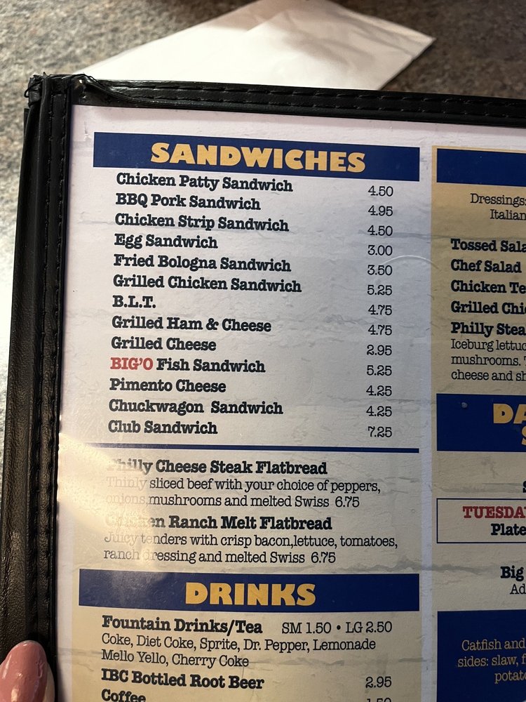 “ This is a small town diner. If you get there during prime hours, you may have to wait for a table! We had a bacon cheese burger with fries and a grilled ham & cheese with Diet Cokes. Both were yummy. They also have ice cream, shakes & serve breakfast in the morning. We will be back! ”