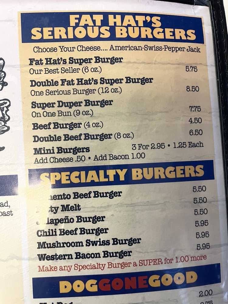 “ If you're looking for a burger full of FLAVOR FatHats is your place! They also have Beans and Cornbread! Down home atmosphere, where everyone knows everyone pretty much. Your food is cooked to order and man is it delicious. The Service is GREAT and you will be a regular before you know it just give it a try and I can promise you that you will be adding FatHats to your weekly schedule ”